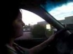 Liz driving, Ale filming, Liz makes a left and almost crashes into the curb.